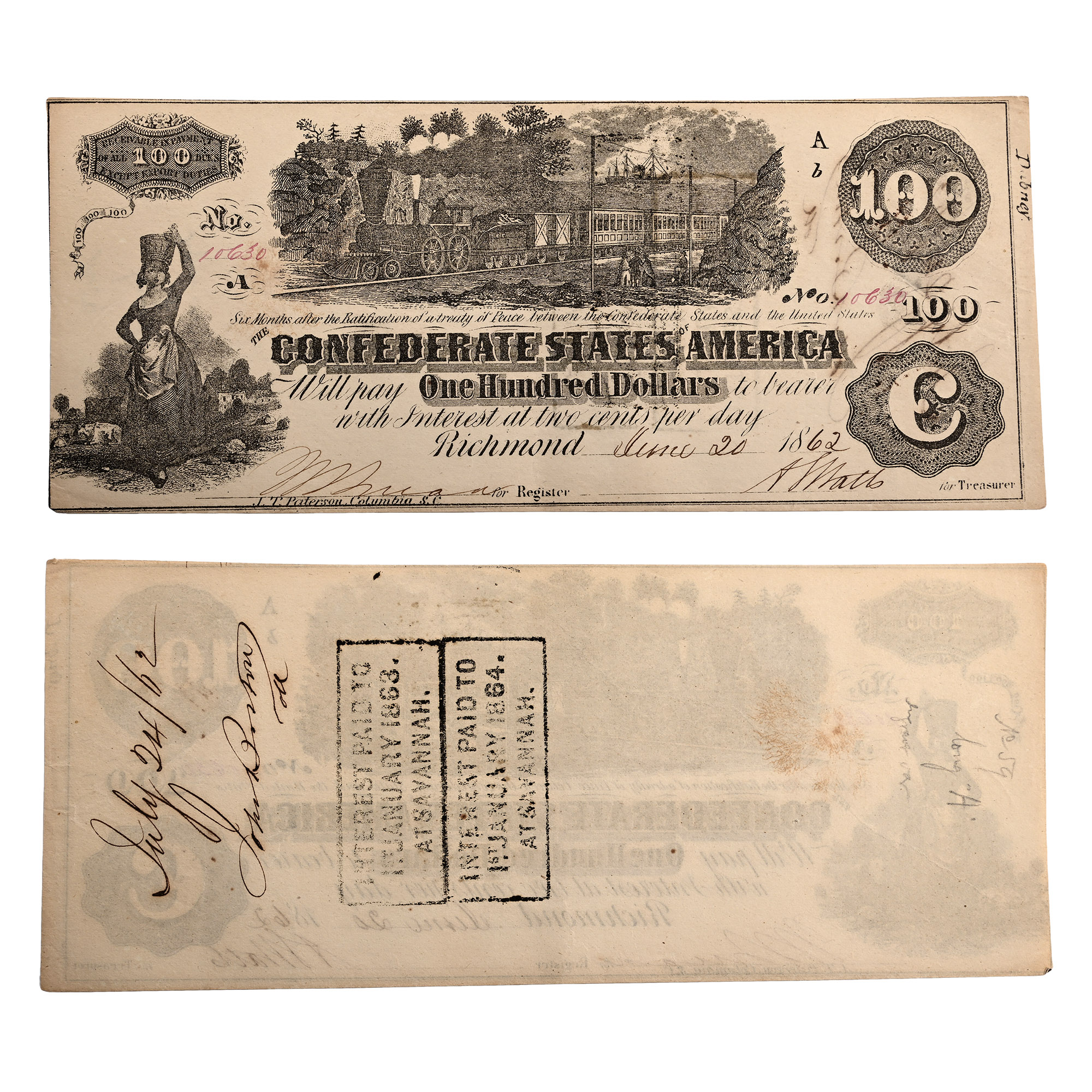 Confederate States of America, One Hundred Dollars T39. Richmond, 20 June 1862. S/N: 10630.