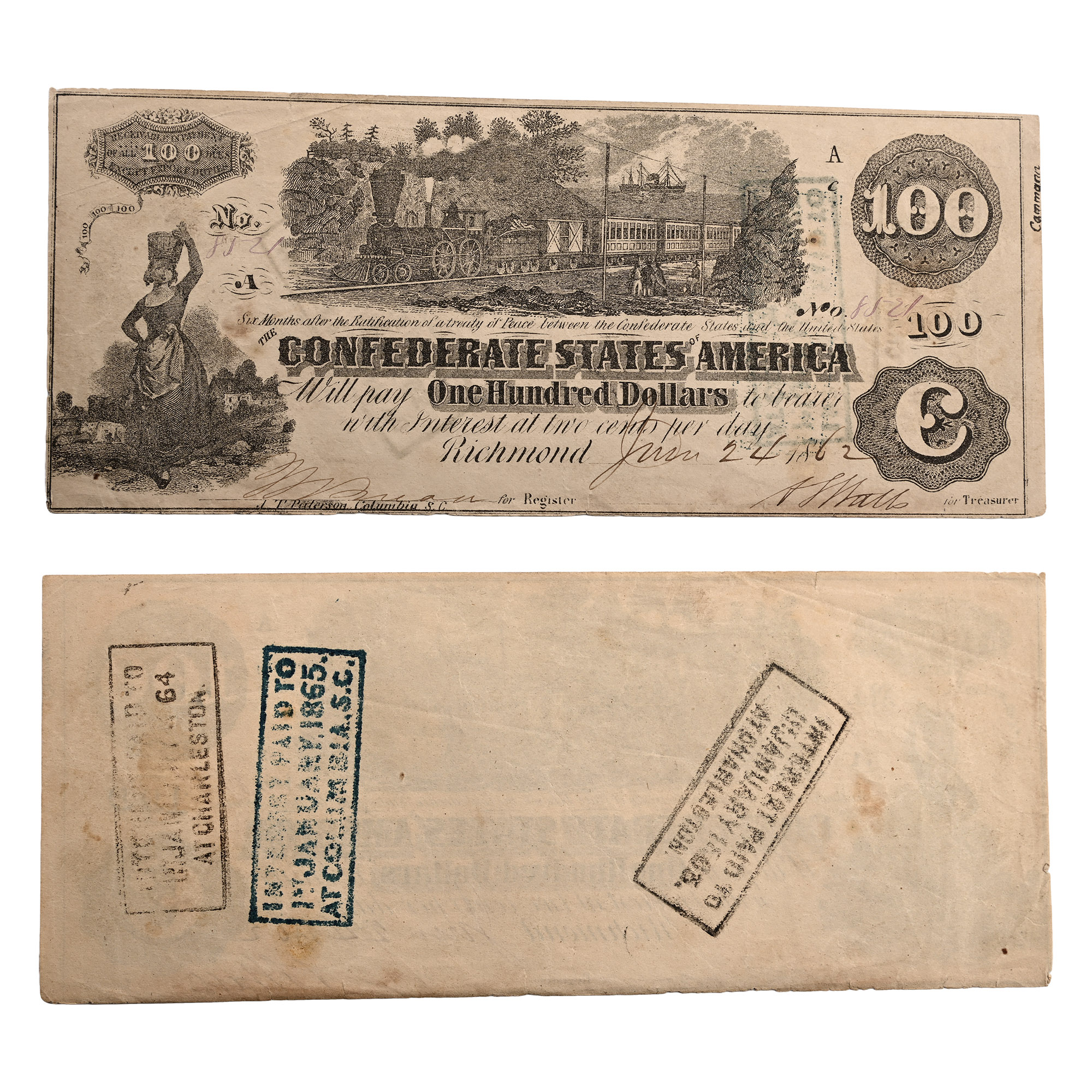 On back, three stamps: INTEREST PAID TO 1ST JANUARY 1863. AT CHARLESTON; INTEREST PAID TO 1ST JANUARY 1864. AT CHARLESTON; INTEREST PAID TO 1ST JANUARY 1865. AT COLUMBIA. S.C. P. 44. 195mm x 80mm.