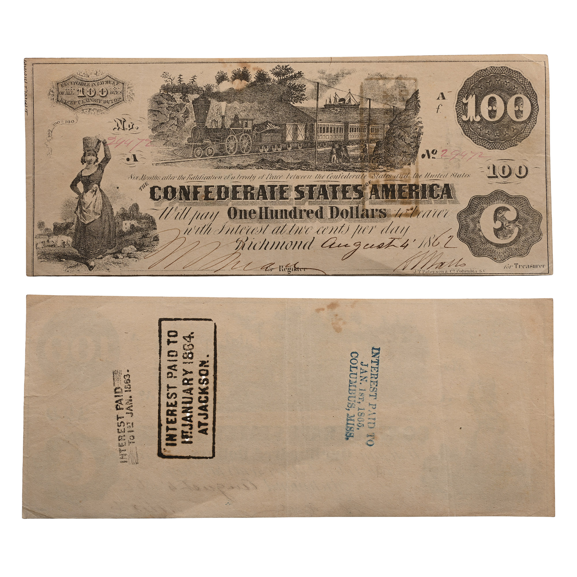 On back, three stamps: INTEREST PAID TO 1ST JAN. 1863.; INTEREST PAID TO 1ST JANUARY 1864. AT JACKSON.; INTEREST PAID TO JAN 1ST, 1865. COLUMBUS, MISS. P. 43. 193mm x 81mm.