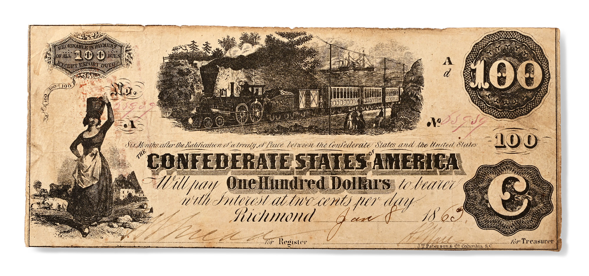 Confederate States of America, One Hundred Dollars T40. Richmond, 8 June 1863. S/N: 65959.