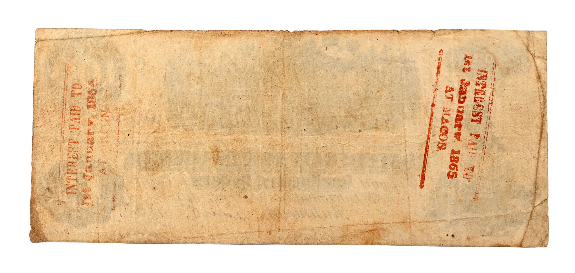 Two "Interest Paid" stamps on back: INTEREST PAID TO 1ST JANUARY 1864 and AT MACON, INTEREST PAID TO 1ST JANUARY 1865. AT MACON. P. 36. 190mm x 80mm.