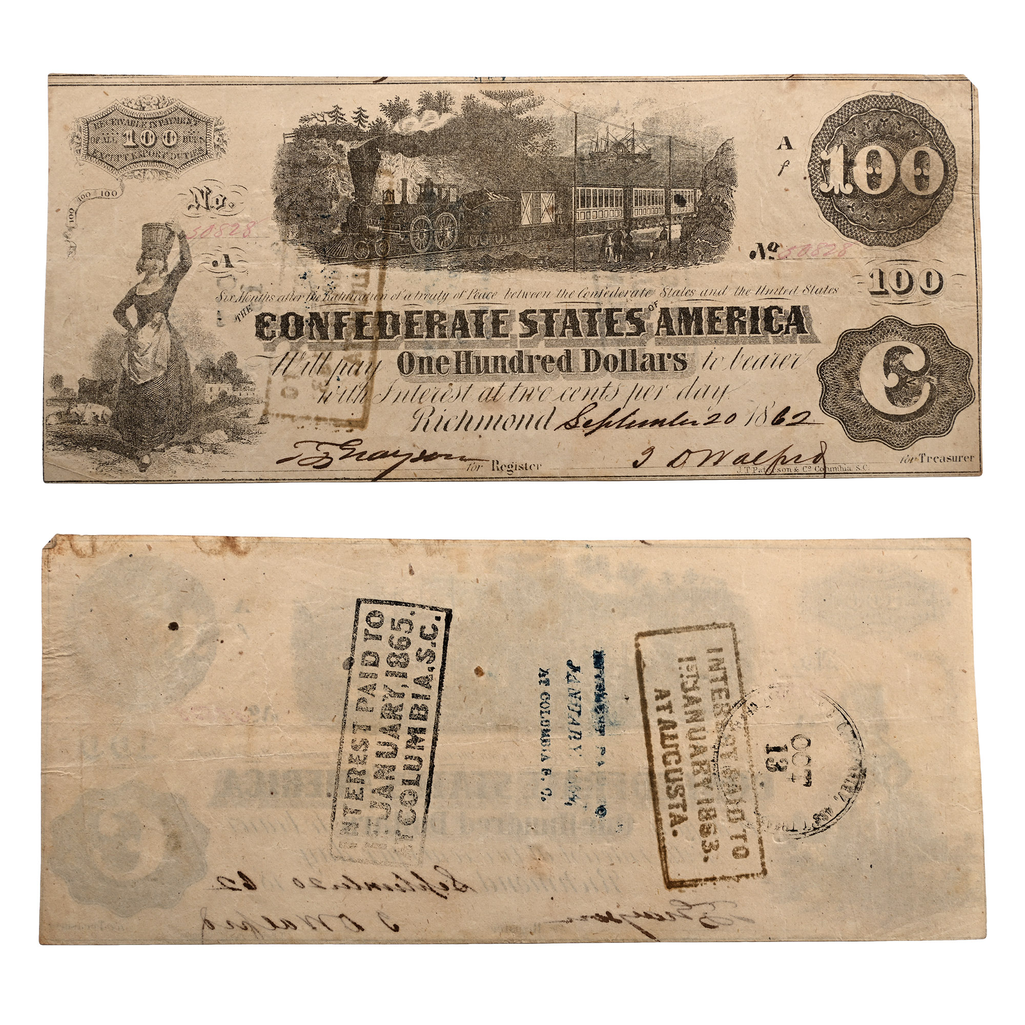 Confederate States of America, One Hundred Dollars T40. Richmond, 8 January 1863. S/N: 68403.