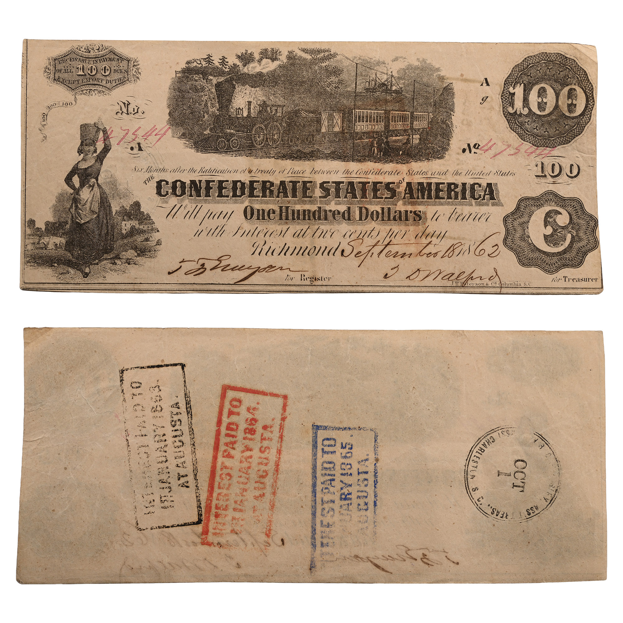 On back, four stamps: INTEREST PAID TO 1ST JANUARY 1863. AT AUGUSTA; INTEREST PAID TO 1ST JANUARY 1864. AT AUGUSTA.; INTEREST PAID TO 1ST JANUARY 1865. AT AUGUSTA.; ISS[...]SLEY. ASS. [...] TREAS.. / OCT 1 / CHARLESTON S.C. P. 38. 187mm x 80mm.