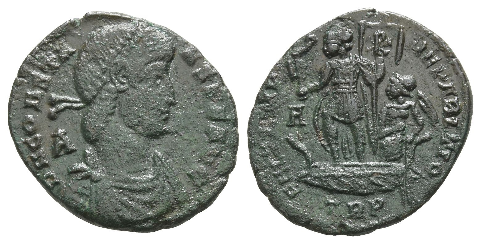 1st officina. D N CONSTANS P F AVG, pearl-diademed, draped and cuirassed bust to right; A behind / FEL TEMP REPARATIO, emperor standing to left on galley, holding Victory on globe and Chi-Ro standard, behind, Victory steering ship; A in left field, TRP in exergue. RIC VIII 243. 4.12gr, 22mm, 12h.