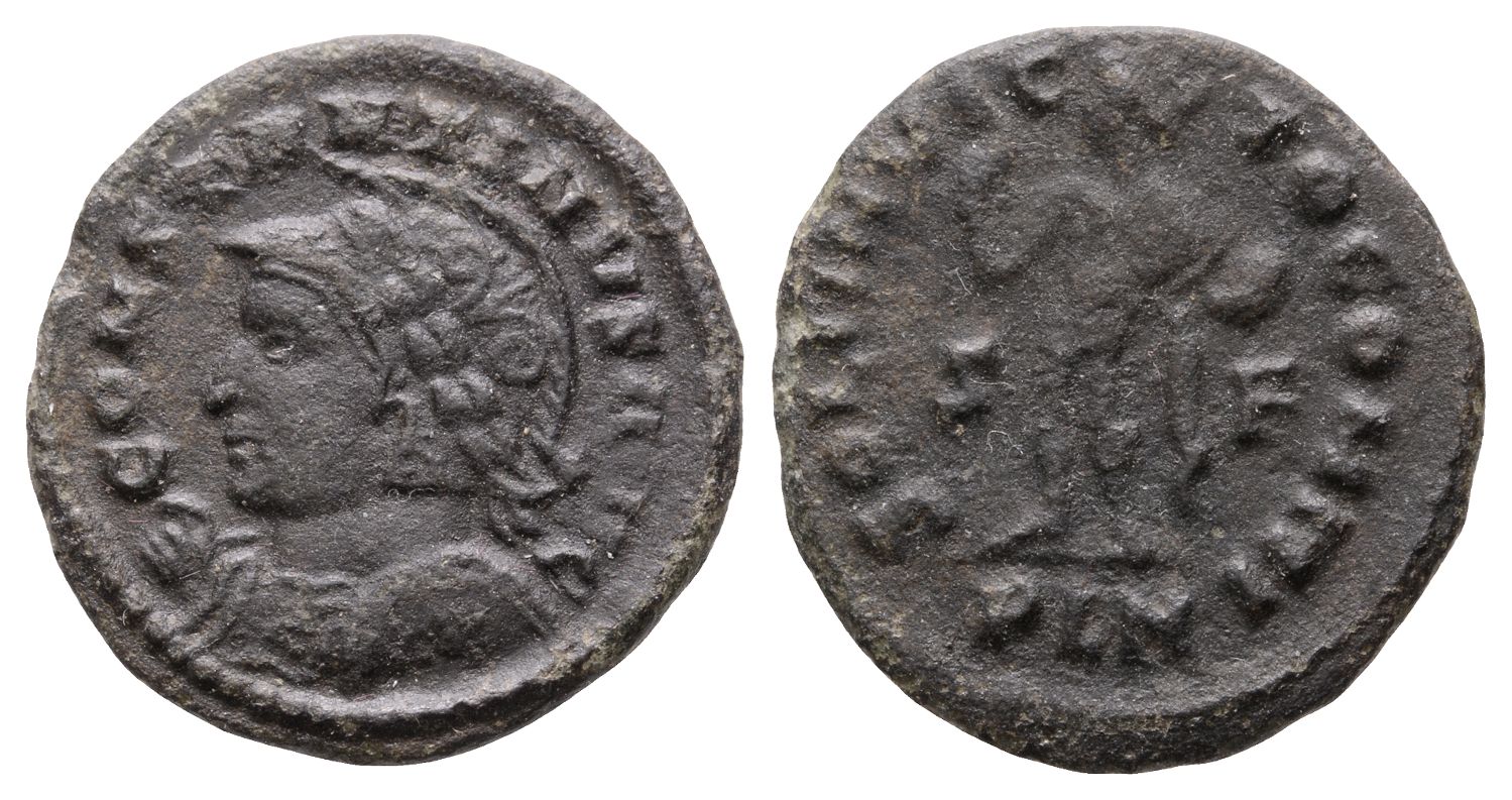 London mint; struck AD 313-314. 1st officina. CONSTANTINVS AVG, laureate, helmeted and cuirassed bust to left, holding spear and shield / SOLI INVICTO COMITI, Sol standing to left, raising right hand and holding globe; S F across fields, PLN in exergue. RIC VII 18; C&T 8.02.026. 2.88gr, 20mm, 6h