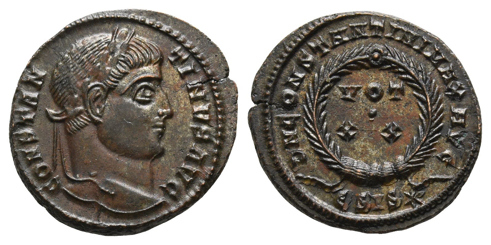 Siscia mint; struck AD 320-321. 5th officina. CONSTANTINVS AVG, laureate head to right / D N CONSTANTINI MAX AVG, laurel wreath enclosing VOT • X X; ЄSIS(star) below. RIC VII 159. 3.28gr, 20mm, 1h