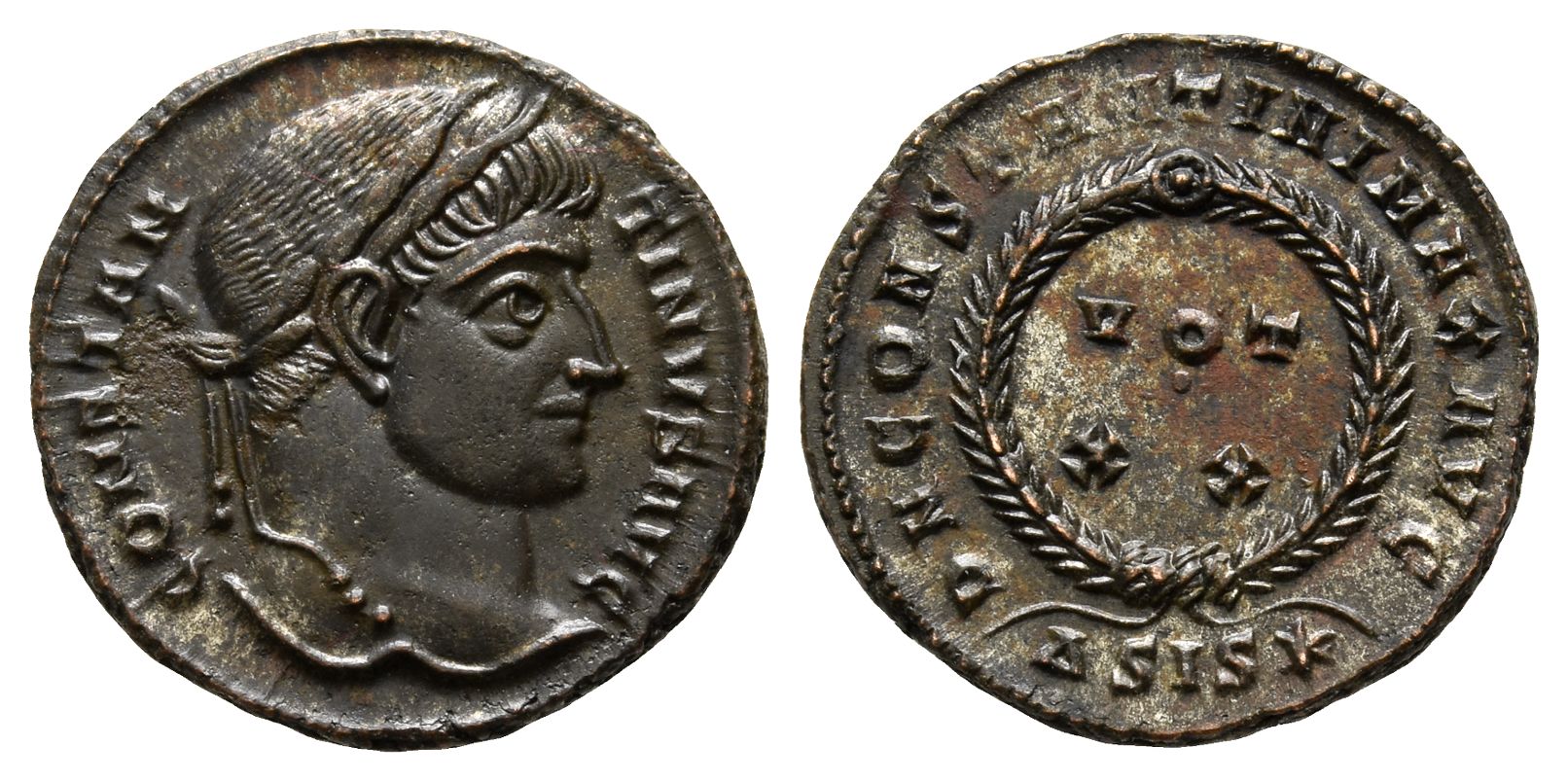 Siscia mint; struck AD 320-321. 4th officina. CONSTANTINVS AVG, laureate head to right / D N CONSTANTINI MAX AVG, laurel wreath enclosing VOT • X X; ΔSIS(star) below. RIC VII 159. 2.99gr, 18mm, 12h.