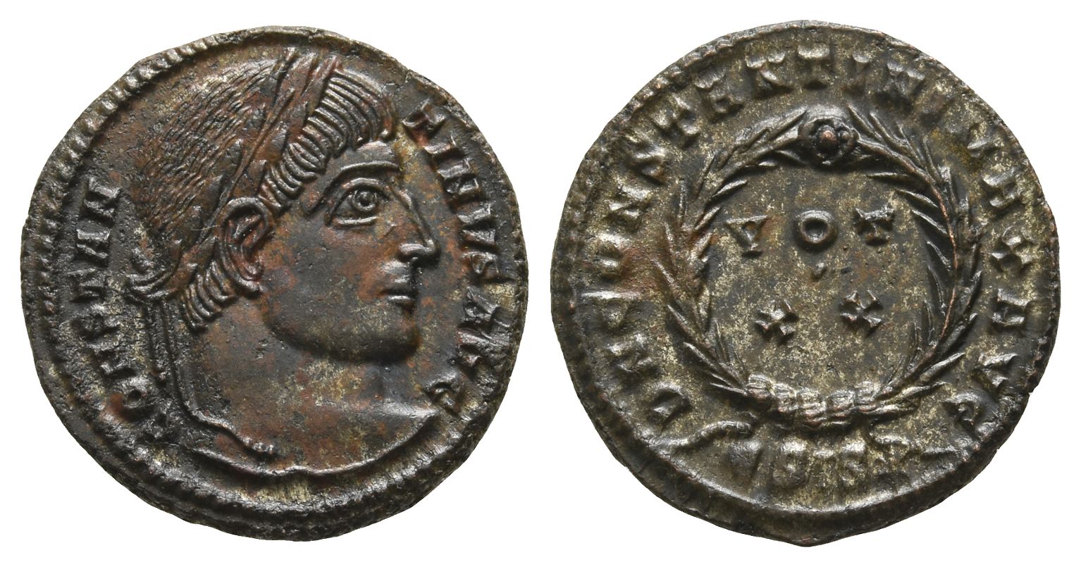 Siscia mint; struck AD 320-321. 5th officina. CONSTANTINVS AVG, laureate head to right / D N CONSTANTINI MAX AVG, wreath enclosing VOT • XX in two lines; ЄSIS(star) in exergue. RIC VII 159. 3.13gr, 19mm, 8h.