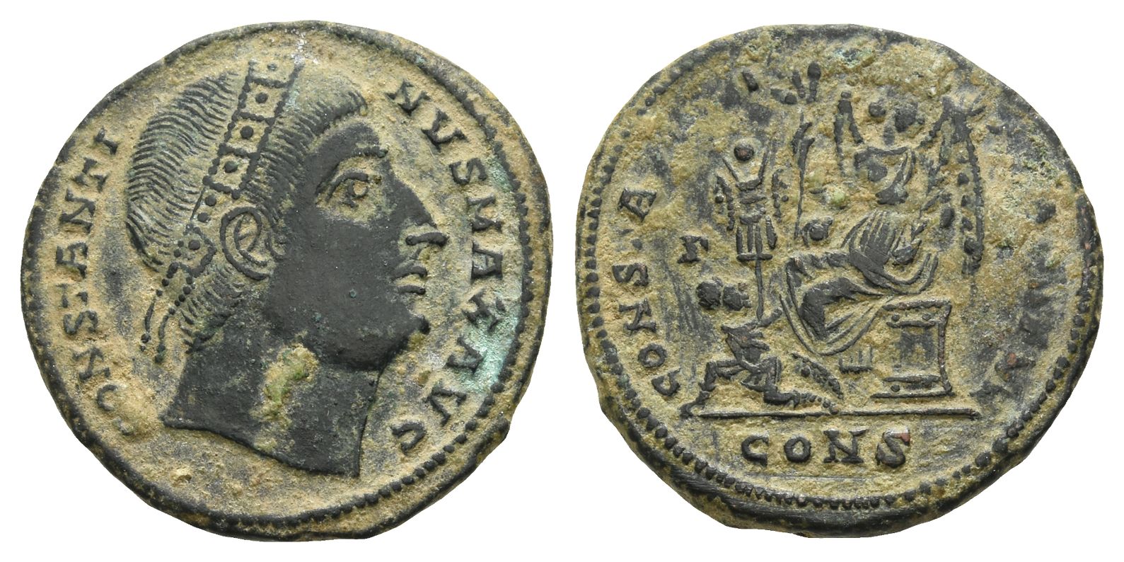 Constantinople mint; struck AD 328. 3rd officina. Dafne coinage. CONSTANTI-NVS MAX AVG, rosette-diademed head to right, looking upwards / CONS[T]A[NTINIANA DAFNE], Victory seated to left on cippus, head to right, holding palm branch in each hand; trophy in front, at the foot of which captive kneeling to left, head to right, spurned by Victory; Γ in left field, CONS in exergue. RIC VII 32; LRBC 992. 3.25gr, 20mm, 11h.