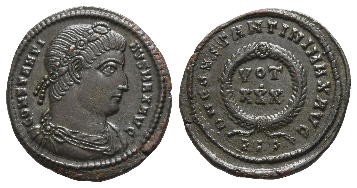 Rome mint; struck AD 329-330. CONSTANTINVS MAX AVG, diademed, draped and cuirassed bust to right / DN CONSTANTINI MAX AVG, VOT XXX in two lines within wreath; RFP below. RIC VII 322. 3.30gr, 21mm, 11h.