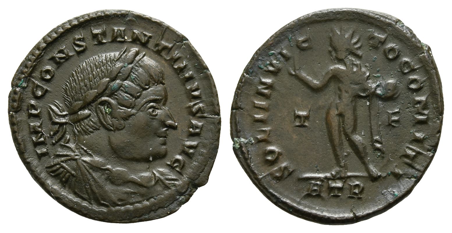 Treveri mint; struck AD 316. 1st officina. IMP CONSTANTINVS AVG, laureate, draped and cuirassed bust to right / SOLI INVICTO COMITI, Sol standing facing, head to left, raising one hand and holding globe; T F across fields, ATR in exergue. RIC VII 95. 2.65gr, 20mm, 6h.
