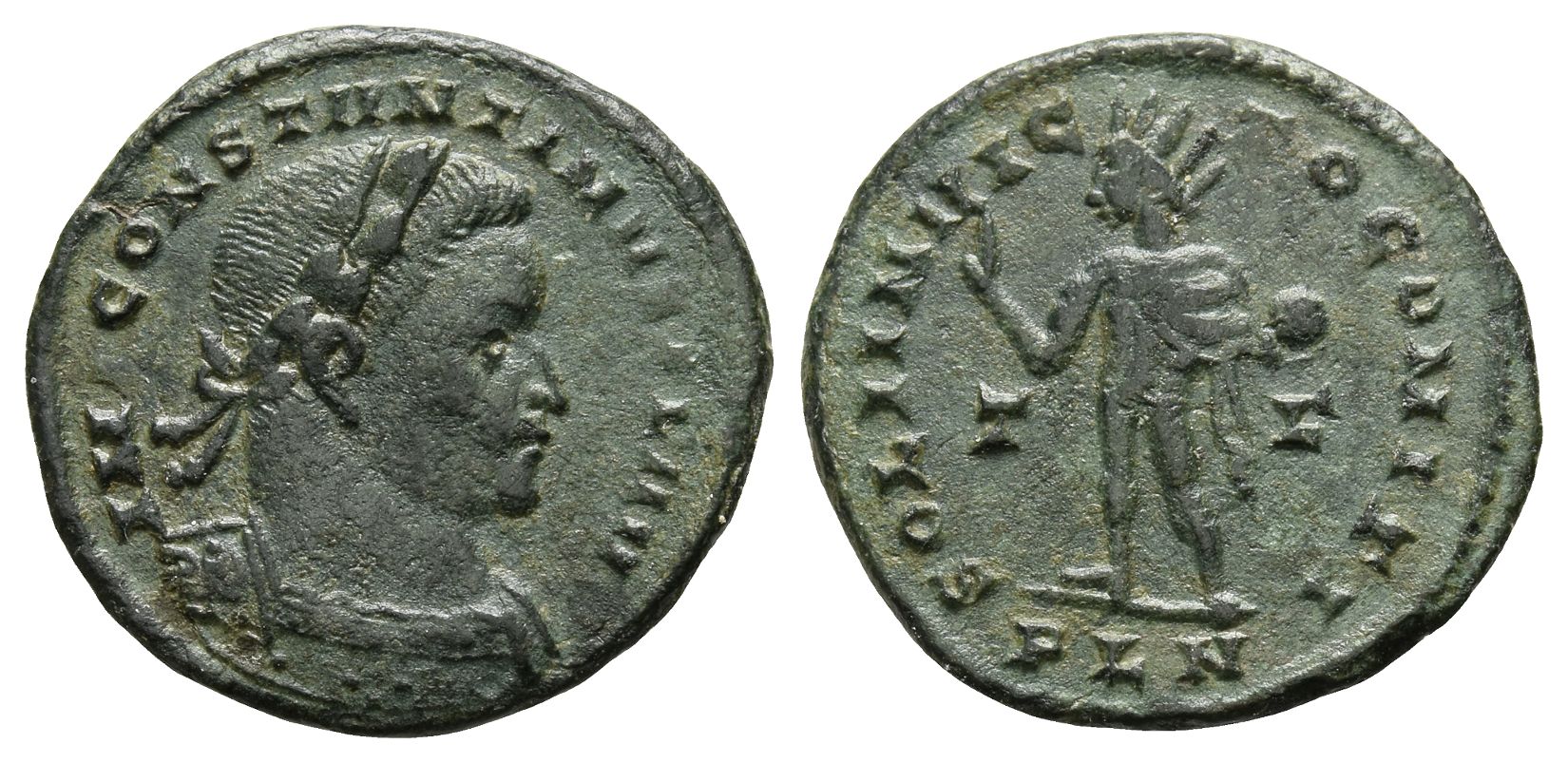 London mint; struck AD 310. 1st officina. IMP CONSTANTINVS P F AVG, laureate and cuirassed bust to right / SOLI INVICTO COMITI, radiate Sol standing facing, head to left with chlamys around shoulders, with right hand raised and holding globe in left; T F across fields, PLN in exergue. RIC VI 121a; C&T 6.02.010; RML 249. 3.70gr, 21mm, 6h.