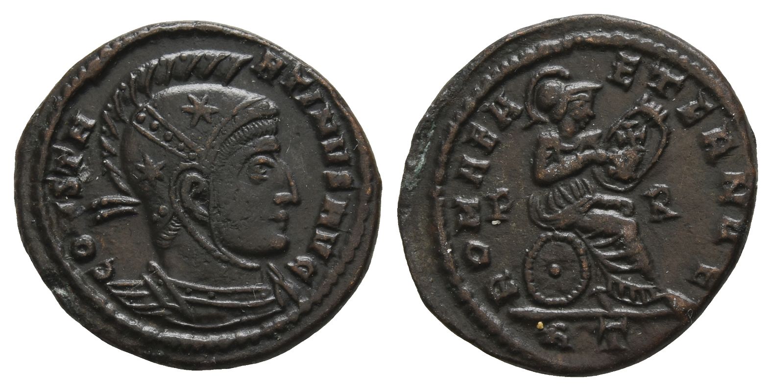 Rome mint. CONSTANTINVS AVG, helmeted and cuirassed bust to left / ROMAE AETERNAE, Roma seated to right on shield, holding another shield inscribed X V in two lines; P R across fields, RT in exergue. RIC VII 146. 3.43gr, 20mm, 7h.