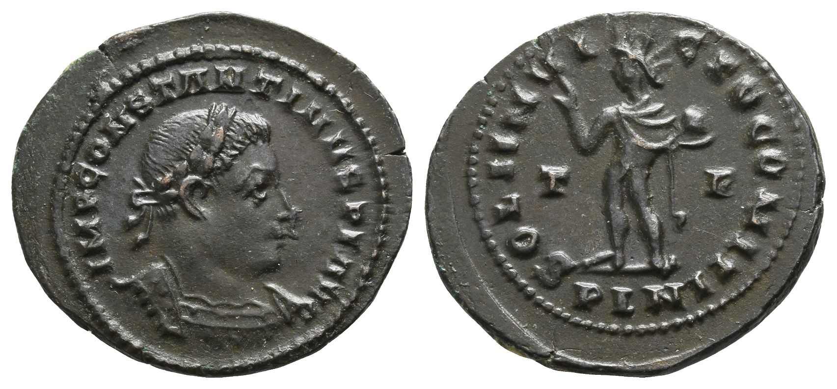 London mint; struck AD 310. 1st officina. IMP CONSTANTINVS P F AVG, laureate and cuirassed bust to right / SOLI INVICTO COMITI, radiate Sol standing facing, head to left with chlamys around shoulders, with right hand raised and holding globe in left; T F across fields, PLN in exergue. RIC VI 121a; C&T 6.02.010; RML 249. 5.09gr, 26mm, 6h.