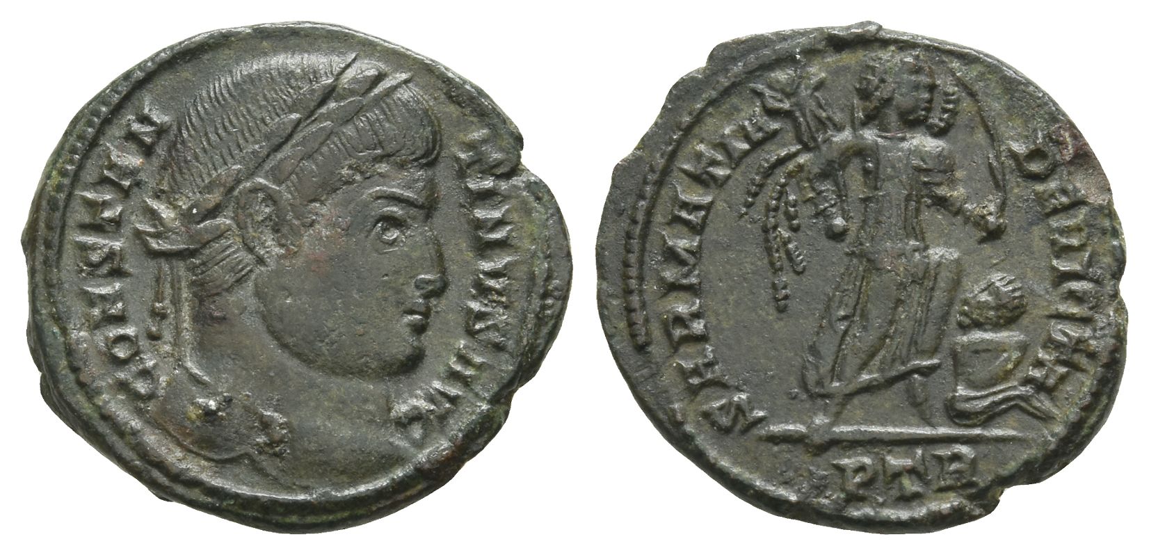 1st officina. CONSTANTINVS AVG, laureate head to right / SARMATIA DEVICTA, Victory advancing to right, holding trophy and palm, spurning captive seated on ground to right; PTR in exergue. RIC VII 429 corr. (palm). 3.32gr, 20mm, 6h.