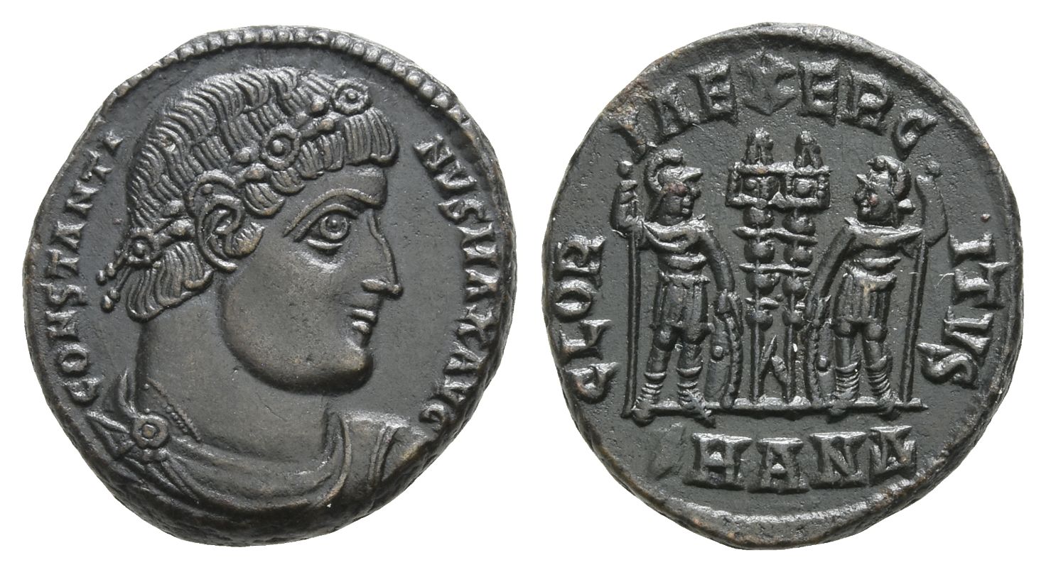 4th officina. CONSTANTINVS MAX AVG, rosette-diademed, draped and cuirassed bust to right / GLORIA EXERCITVS, two soldiers standing facing each other, each holding spear and resting shield on ground, two standards between; SMANΔ in exergue. RIC VII 86. 3.50gr, 17mm, 12h.