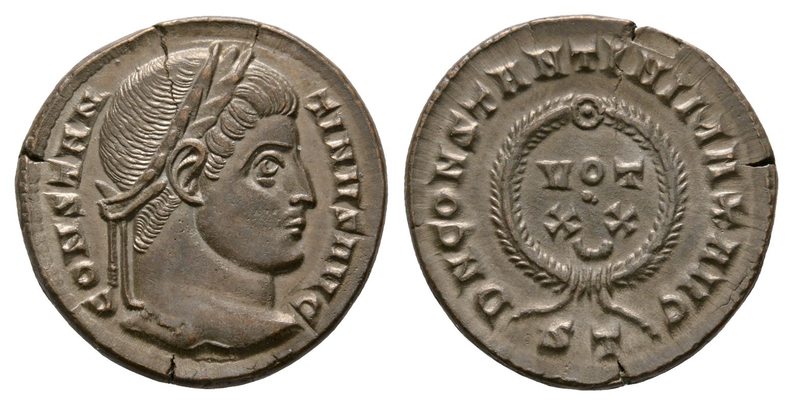 Ticinum mint; struck AD 322-325. 2nd officina. CONSTAN-TINVS AVG, laureate head to right / D N CONSTANTINI MAX AVG around wreath enclosing VOT • XX in two lines above crescent; ST below. RIC VII 167. 3.24gr, 19mm, 12h