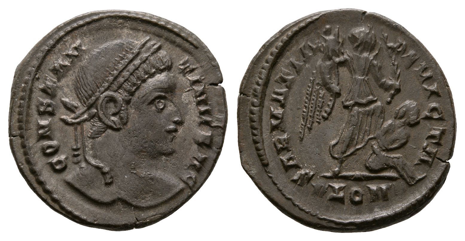 London mint; struck AD 324. 1st officina. CONSTAN-TINVS AG, laureate head to right / SARMATIA DEVICTA, Victory advancing to right, holding trophy with left hand and palm with right, trampling captive seated on ground to right; PLON(crescent) in exergue. RIC VII 290; C&T 10.01.003; RML 1109. 3.41gr, 20mm, 6h