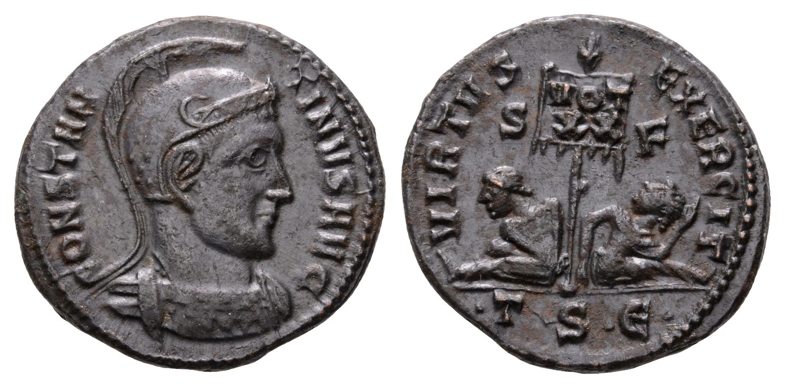 Thessalonica mint; struck AD 320. 5th officina. CONSTAN-TINVS AVG, helmeted and cuirassed bust to right / VIRTVS EXERCIT, standard inscribed VOT XX in two lines, two captives seated flanking at base in attitude of mourning; S-F across upper fields, • TS • Є • in exergue. RIC VII 75. 3.19gr, 19mm, 12h.