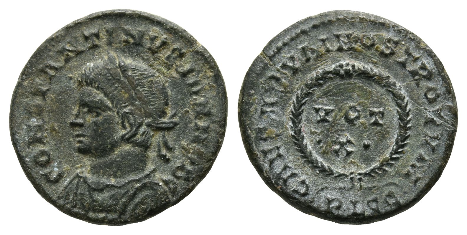 Lugdunum mint; struck AD 323-324. CONSTANTINVS IVN NOB C, laureate, draped and cuirassed bust to left / CAESARVM NOSTRORVM, wreath encircling VOT •X•; PLGC in exergue. RIC VII 221. 2.69gr, 18mm, 1h