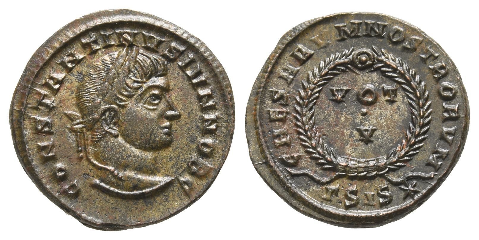 Siscia mint; struck AD 320-321. 3rd officina. CONSTANTINVS IVN NOB C, laureate head to right / CAESARVM NOSTRORVM, wreath enclosing VOT • V in two lines; ΓSIS(star) below. RIC VII 163. 3.02gr, 19mm, 8h.