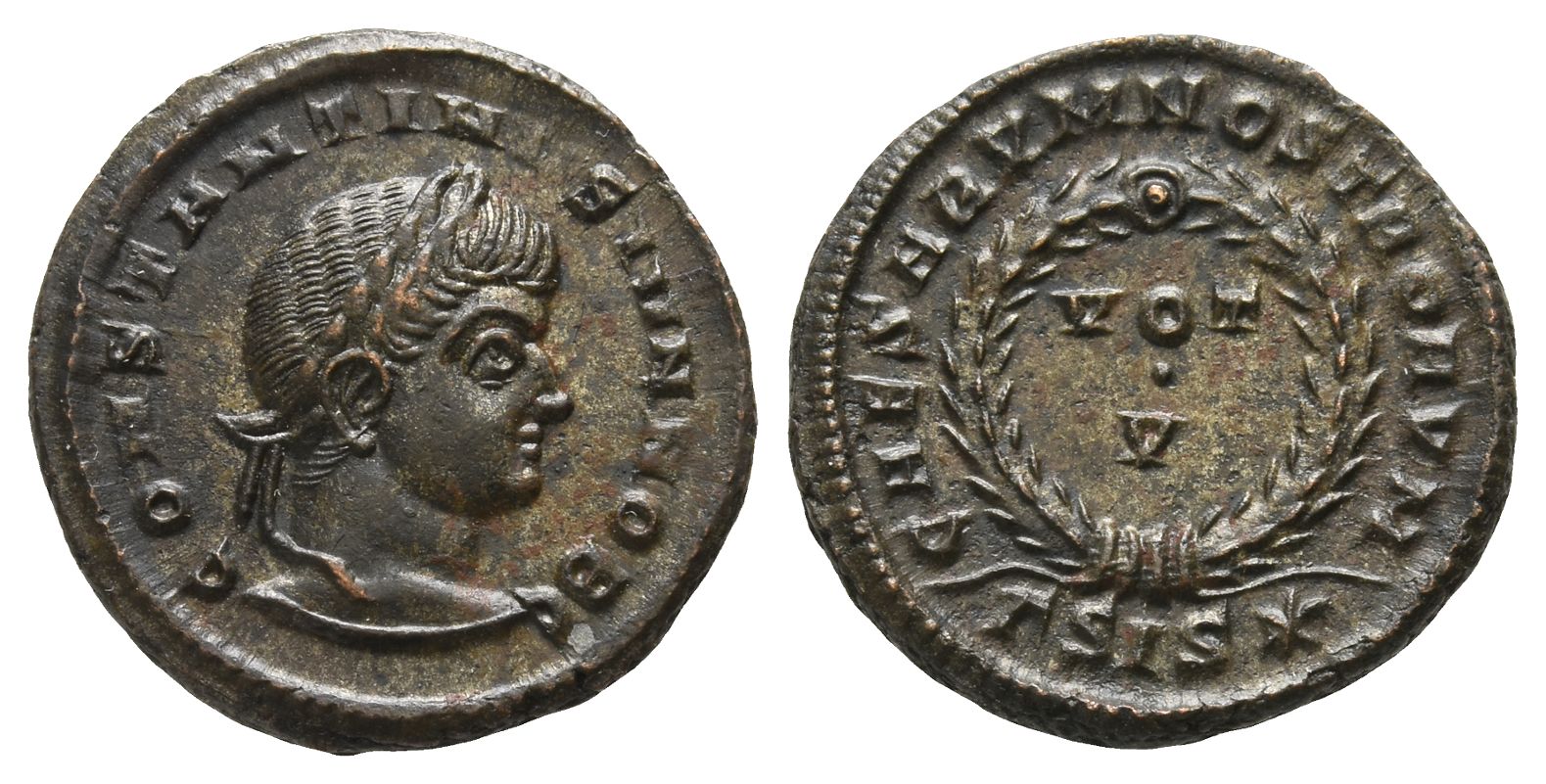 Siscia mint; struck AD 320-321. 3rd officina. CONSTANTINVS IVN NOB C, laureate head to right / CAESARVM NOSTRORVM, wreath enclosing VOT • V in two lines; ΓSIS(star) below. RIC VII 163, 3,19gr, 19mm, 5h.