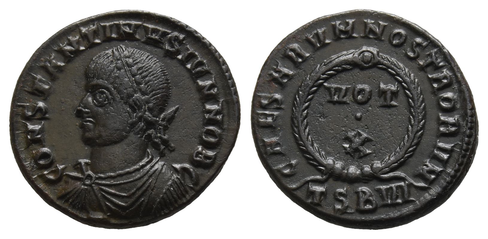 Thessalonica mint; struck AD 324. 2nd officina. CONSTANTINVS IVN NOB C, laureate, draped and cuirassed bust to left / CAESARVM NOSTRORVM, VOT • X in two lines within laurel wreath; TSBVI in exergue. RIC VII 128. 3.15gr, 17mm, 6h.