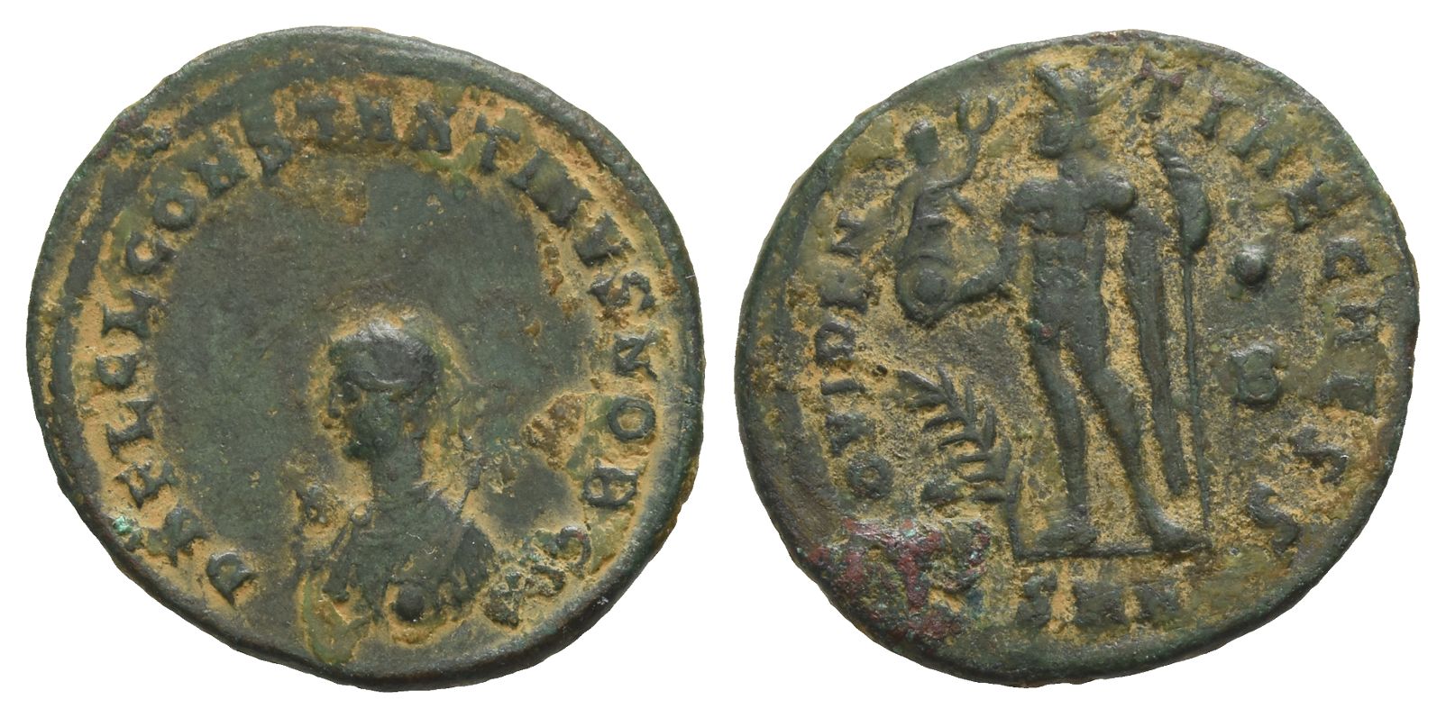 Nicomedia mint; struck AD 317-320. 2nd officina. D N FL CL CONSTANTINVS NOB C, laureate and draped bust to left, globe and sceptre in left hand, mappa in right / [P]ROVIDEN-TIAE CAESS, Jupiter standing to left, chlamys over left shoulder, holding Victory on globe with right hand and leaning on sceptre with left; palm branch in left field, pellet over B in right; SMN in exergue. RIC VII 35. 2.65gr, 20mm, 6h.