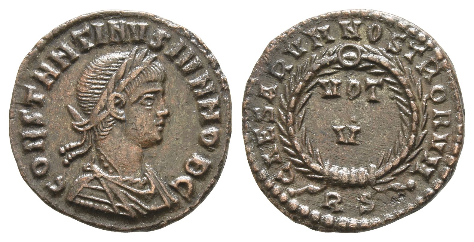 2nd officina. CONSTANTINVS IVN NOB C, laureate, draped and cuirassed bust to right / CAESARVM NOSTRORVM, around VOT V in laurel wreath; R S in exergue. RIC VII 236. 2.52gr, 19mm, 6h.