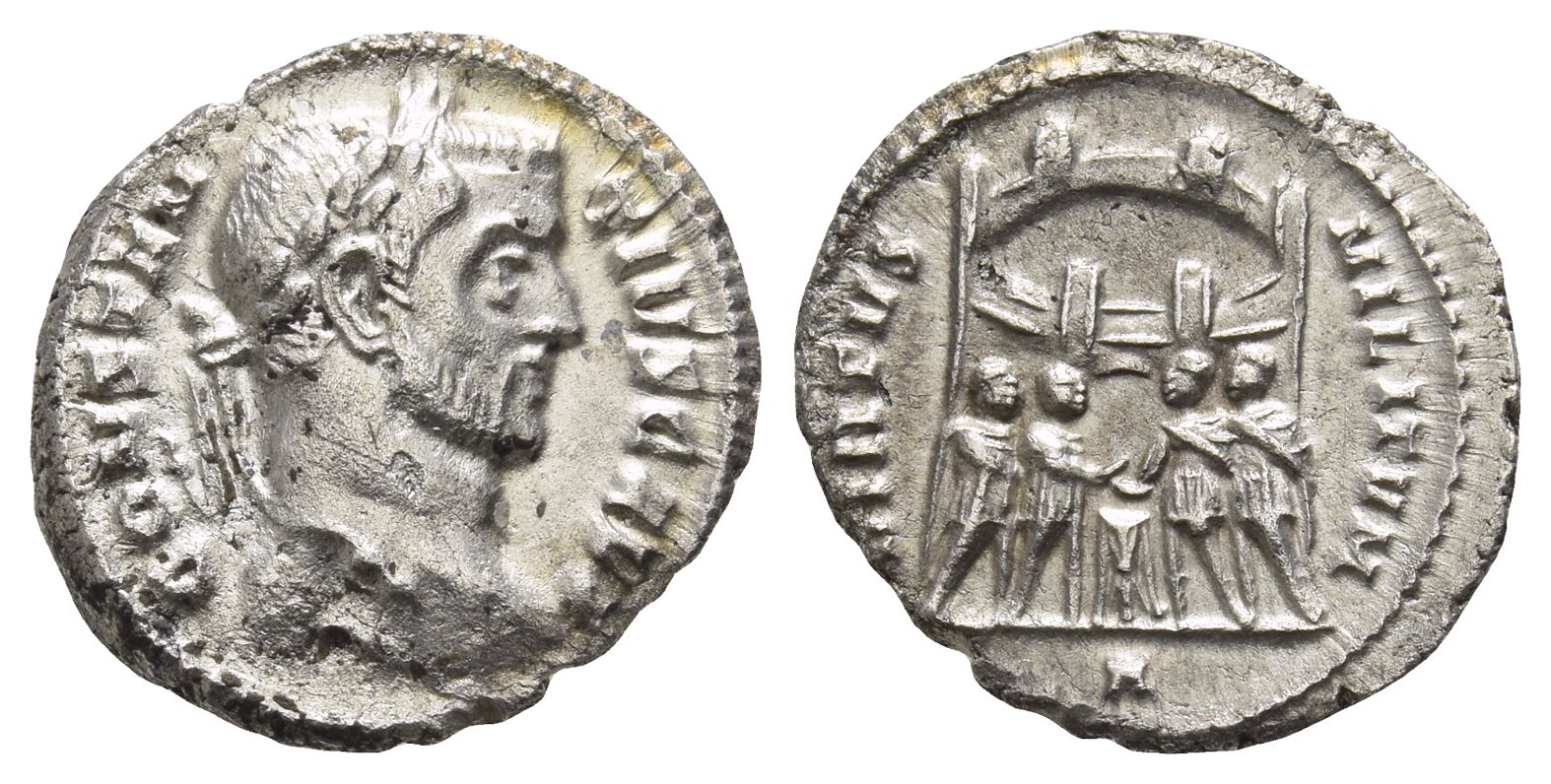 CONSTANTIVS CAES, laureate head to right / VIRTVS MILITVM, four tetrarchs sacrificing over tripod before city enclosure with six turrets; A in exergue. RIC VI 42a; RSC 314†b. 3.30gr, 19mm, 12h.