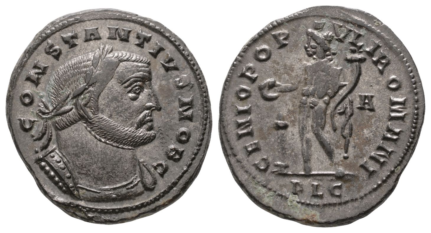 Lugdunum mint; struck AD 300-302. 1st officina. CONSTANTIVS NOB C, laureate and cuirassed bust to right / GENIO POP-VLI ROMANI, Genius standing facing, head to left, wearing modius, holding patera with right hand over lit altar and cornucopia with left; A in right field, PLG in exergue. RIC VI 129a; Bastien 241. 10.91gr, 29mm, 12h
