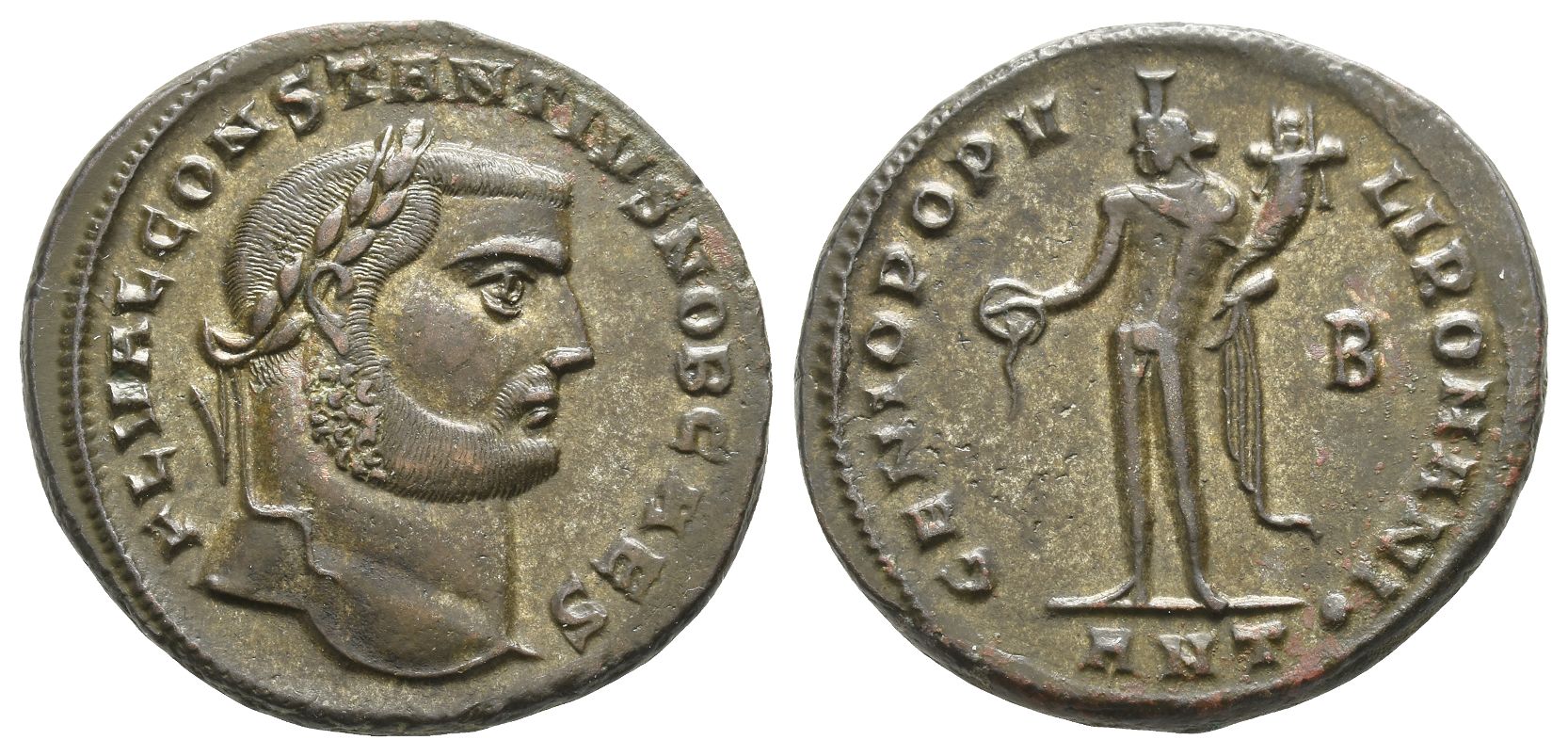 2nd officina. FL VAL CONSTANTIVS NOB CAES, laureate head to right / GENIO POPV-LI ROMANI, Genius, nude but for chlamys over his left shoulder, standing facing, head to left, holding patera, from which liquor flows, in his right hand and cornucopia with his left; B in left field, ANT• in exergue. RIC VI 59a. 10.88gr, 29mm, 6h.
