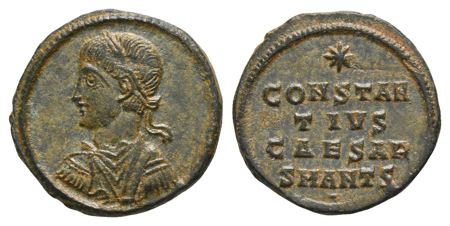 Antioch mint, 6th officina. Struck AD 324-325. Laureate, draped, and cuirassed bust to left / CONSTAN-TIVS CAESAR in three lines; star above; SMANTS • below. RIC VII 60; LRBC 1327. 2.59gr, 18mm, 5h.
