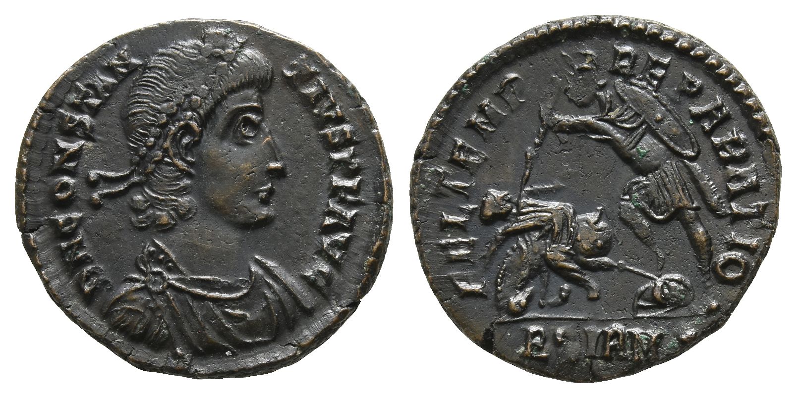 Sirmium mint; struck AD 355-361. 2nd officina. D N CONSTAN-TIVS P F AVG, pearl-diademed, draped and cuirassed bust to right / FEL TEMP REPARATIO, soldier, holding shield, standing to left and spearing fallen horseman below, shield on ground to right; BSIRM• in exergue. RIC VIII 69. 2.85gr, 19mm, 1h.