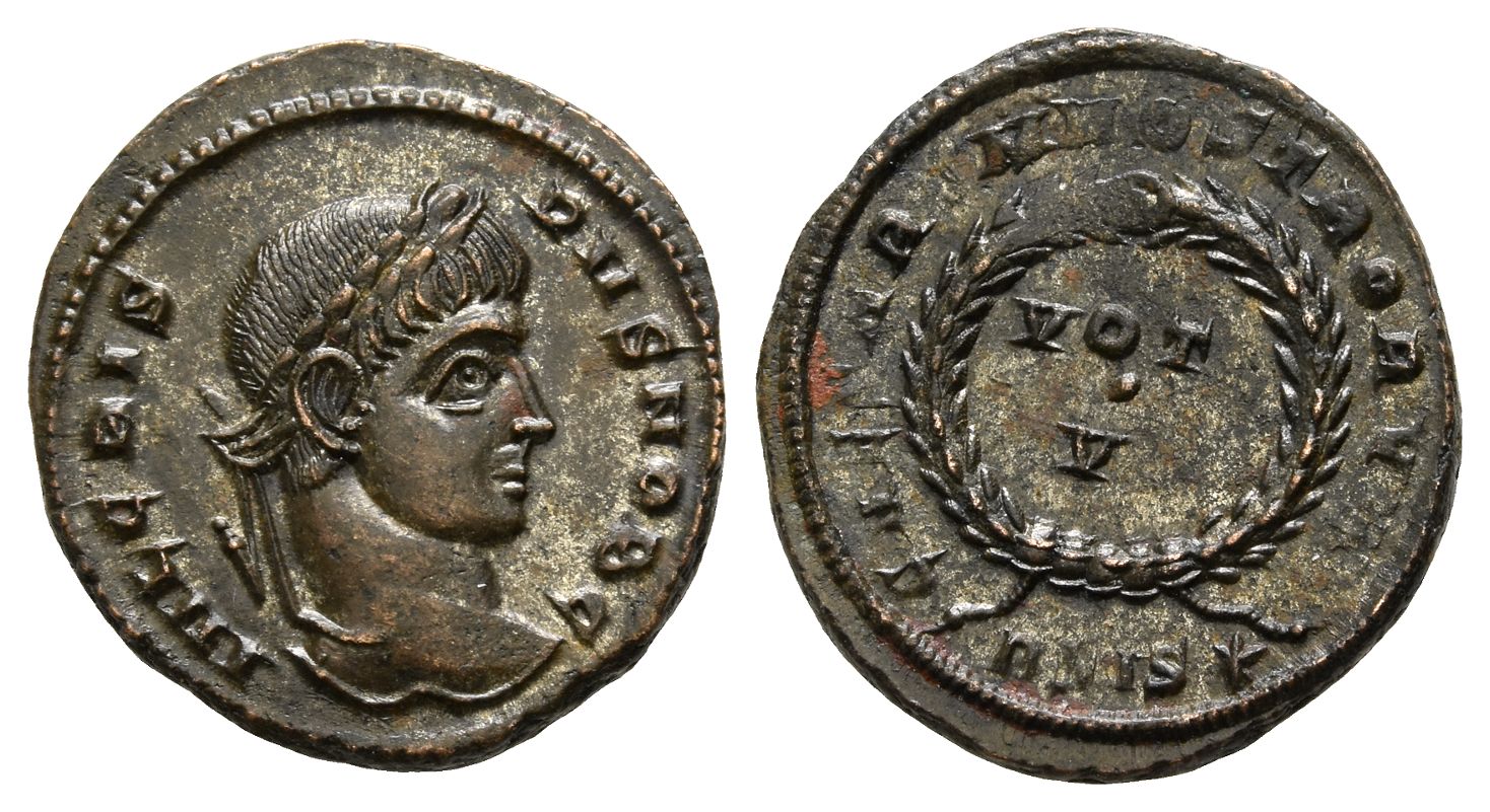 Siscia mint; struck AD 320-321. 2nd officina. IVL CRISPVS NOB C, laureate head to right / CAESARVM NOSTRORVM, wreath enclosing VOT • V in two lines; BSIS(star) in exergue. RIC VII 161. 3.74gr, 20mm 7h.