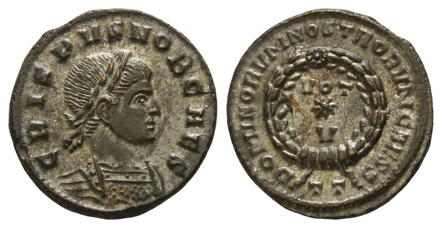 Ticinum mint; struck AD 320. 3rd officina. CRISPVS NOB CAES, laureate and cuirassed bust to right / DOMINORVM NOSTRORVM CAESS, VOT ✷ V in two lines within wreath; star; T T in exergue. RIC VII 135 var. (unlisted officina). 2.74gr, 18mm, 12h.