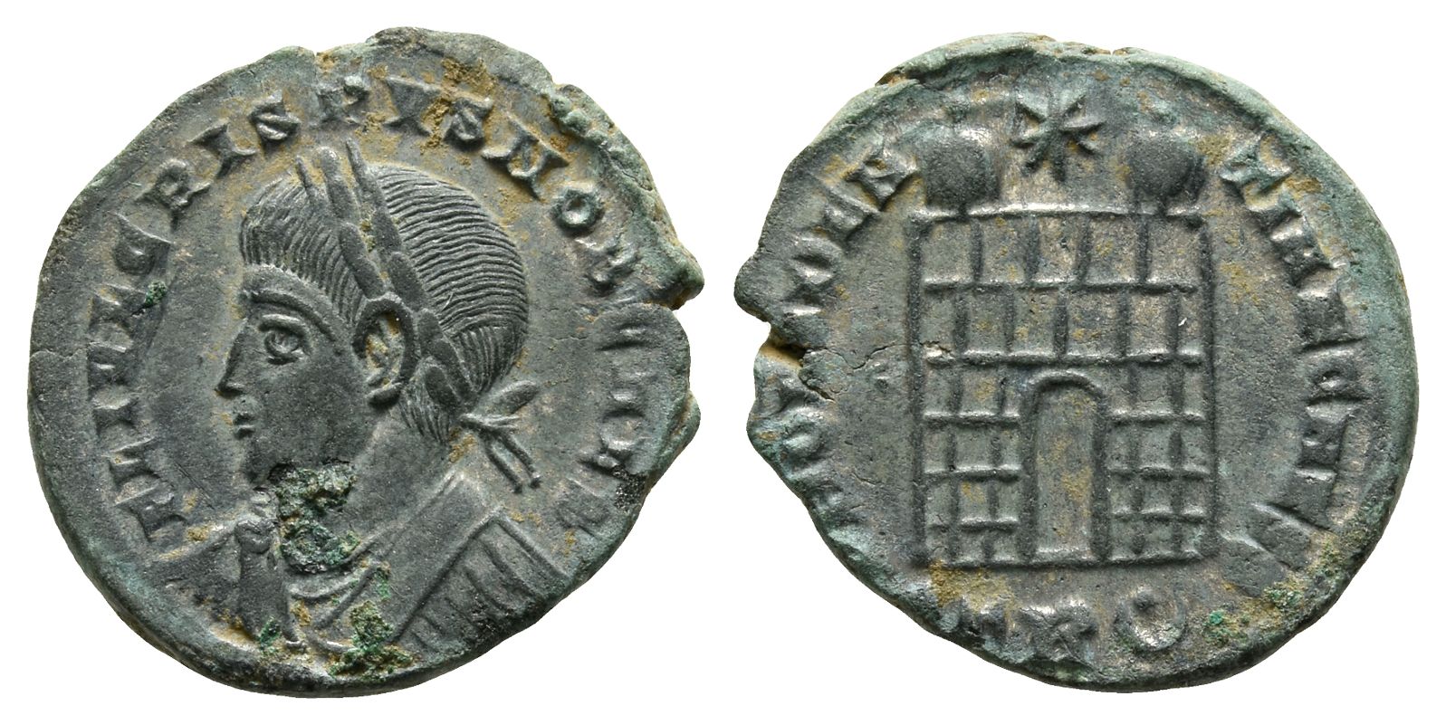 Treveri mint; struck AD 326. FL IVL CRISPVS NOB CAES, laureate, draped and cuirassed bust to left / PROVIDENTIAE CAESS, camp gate with no doors and two turrets; star above, STR (pellet in crescent) in exergue. RIC VII 477. 2.98gr, 19mm, 1h.