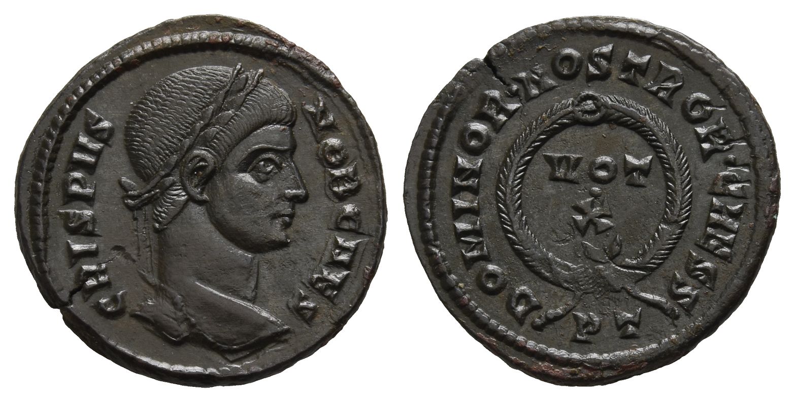 Ticinum mint; struck AD 322-325. 1st officina. CRISPVS NOB CAES, laureate head to right / DOMINOR • NOSTROR • CAESS around wreath containing VOT • X (crescent); P T below. RIC VII 168. 2.71gr, 20mm, 6h.