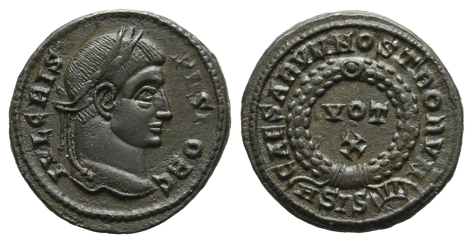 Siscia mint; struck AD 321-324. 1st officina. IVL CRISPVS NOB C, laureate head to right / CAESARVM NOSTRORVM, wreath enclosing VOT X in two lines; ASIS(sunburst) below. RIC VII 181. 3.39gr, 19mm, 6h.