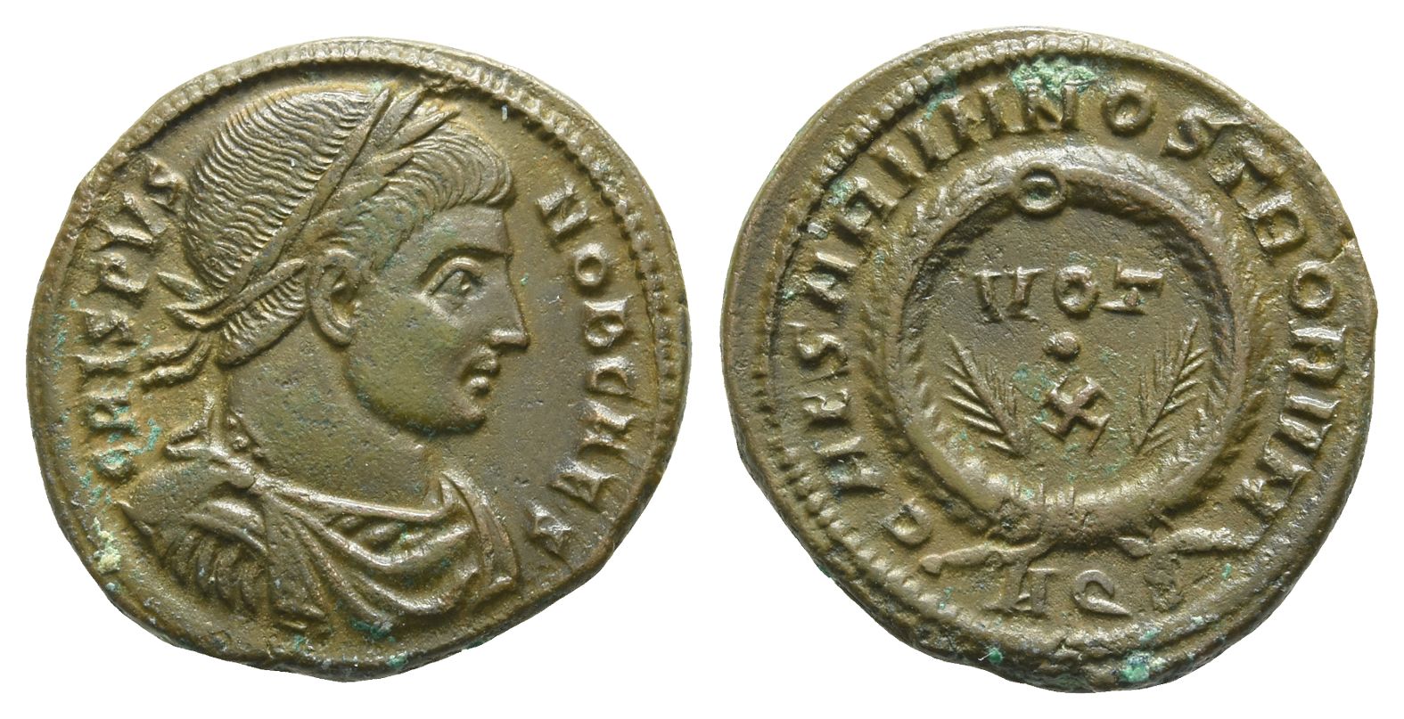 CRISPVS NOB CAES, laureate, draped and cuirassed bust to right / CAESARVM NOSTRORVM around wreath with jewel at apex containing VOT • X, written in three lines; palm fronds to left and right, AQS in exergue. RIC VII 108. 3.30gr, 19mm, 11h.