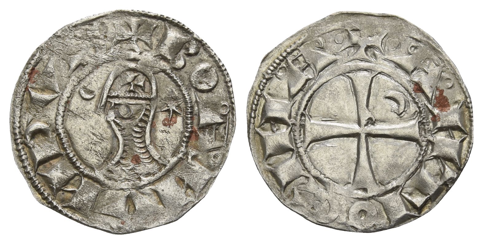 Antioch (Principality) mint. ✠ BOAͶVͶDVS, helmetted head to left, between crescent and star / ✠ AͶTIOCIͶA, cross pattée, crescent in second angle. Metcalf, Crusades, -; CCS -. 1.04gr, 18mm, 6h.