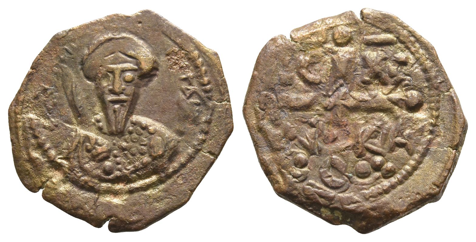 Bust of Tancred facing, wearing turban and holding sword / Cross pommetée, fleuronnée at base; in quarters, IC XC across upper quarters, NI-KA across lower quarters. Metcalf, Crusades 1995, 63-70; CCS 4a. 3.04gr, 21mm, 6h.