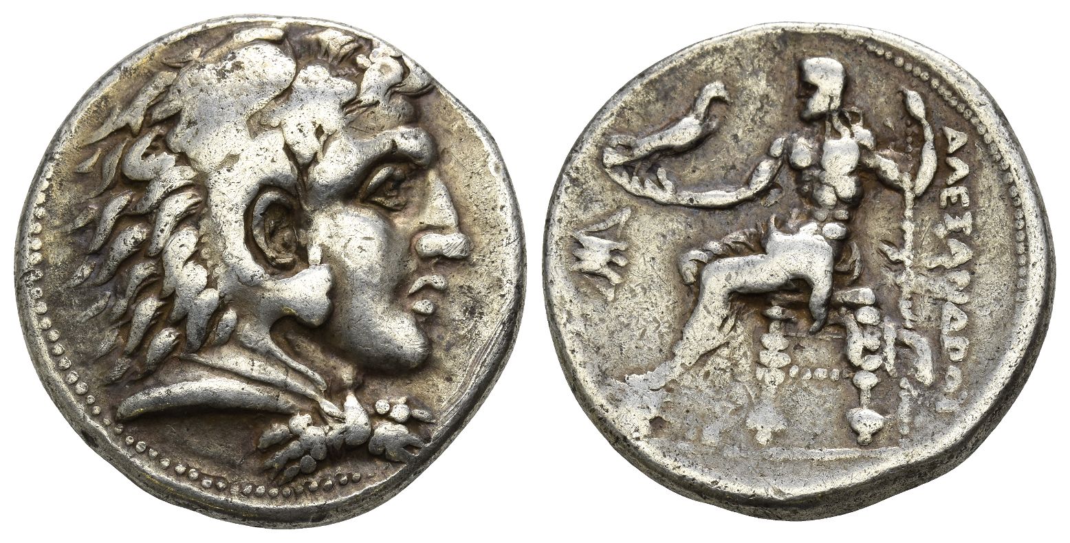 In the name and types of Alexander III of Macedon. Struck circa 325/3-319/8 BC. Head of Herakles to right, wearing lion skin headdress, paws tied beneath chin / ΑΛΕΞΑΝΔΡΟΥ, Zeus seated to left on backless throne, right leg drawn back, his feet resting on a low foot rest, holding long sceptre in his left hand and, in his right, eagle standing to right with closed wings; prow in left field. Zapiti & Michaelidou 24; Price 3094 (Amathos). 16.55gr, 28mm, 6h.