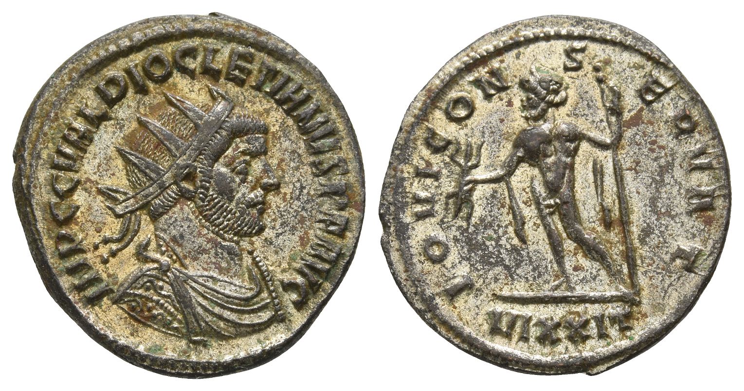 Ticinum mint; struck AD 285. 6th officina. IMP C C VAL DIOCLETIANVS P F AVG, radiate, draped and cuirassed bust to right / IOVI CONSERVAT, Jupiter standing facing, head to left, holding thunderbolt and sceptre; VIXXIT in exergue. RIC V.2 222; Cohen 201. 3.64gr, 22mm, 6h