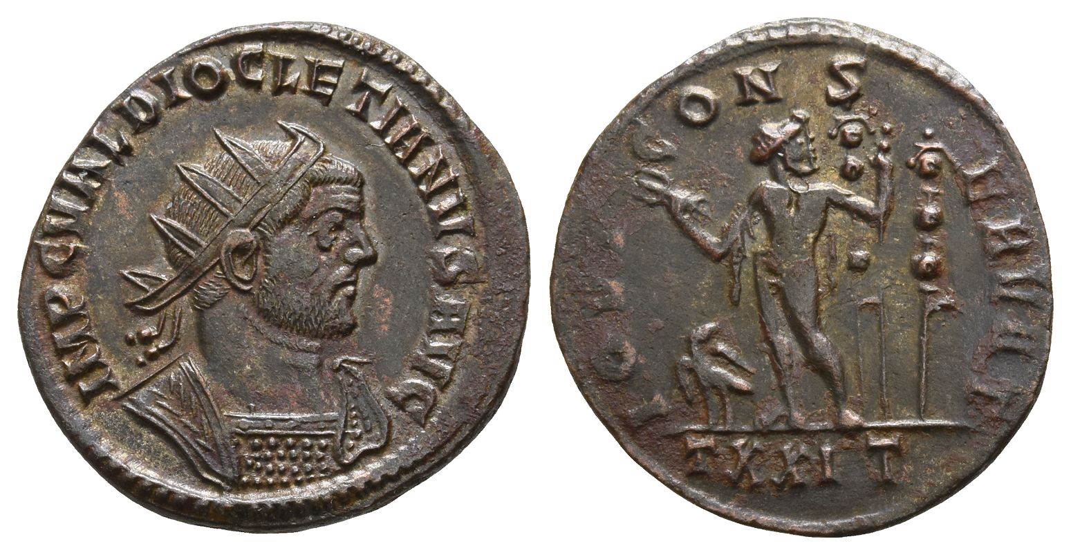 Ticinum mint; struck AD 290-292. 3rd officina. IMP C VAL DIOCLETIANVS AVG, radiate and cuirassed bust to right / IOVI CONSERVAT, Jupiter standing to left, head to right, holding thunderbolt and sceptre, eagle to left, two standards to right; TXXIT in exergue. RIC V.2 228. 3.13gr, 22mm, 12h.