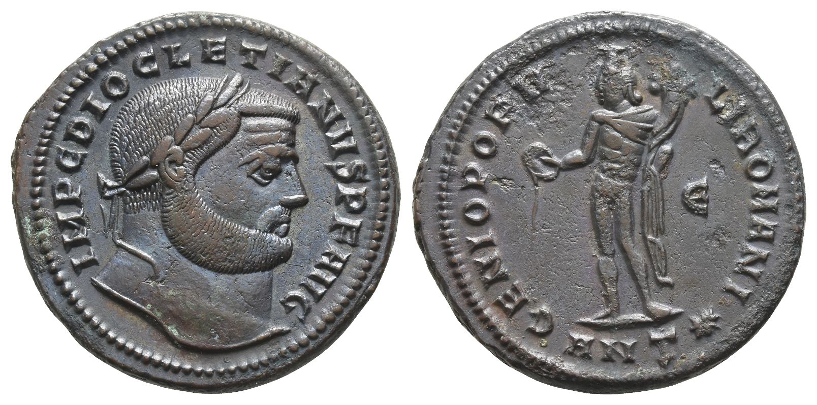 IMP C DIOCLETIANVS P F AVG, laureate head to right / GENIO POPVLI ROMANI, Genius, wearing modius on head, standing to left, holding cornucopia and patera, from which liquor flows; Є in right field, ANT(star) in exergue. RIC VI 56a. 9.88gr, 27mm, 6h.
