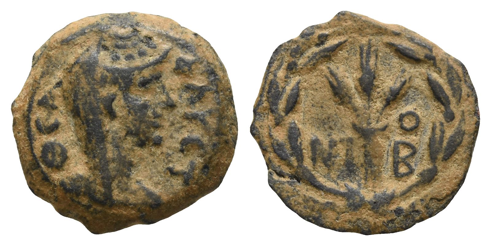 ΘЄΑ ΦΑVϹΤ, veiled and draped bust to right / Three grain ears tied together, NT-BO across fields; all within wreath. RPC IV.3 Online 6365 (temporary); Sofaer 15; Kindler 11; Spijkerman 15. 2.16gr, 15mm, 6h.