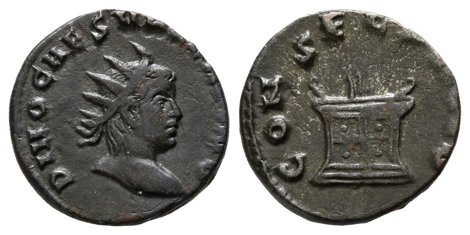 Rome mint; struck AD 258. 2nd-5th emission. DIVO CAES VALERIANO, radiate head to right / CONSECRATIO, lighted altar. RIC V 24; MIR 36, 261g; RSC 12. 3.03gr, 18mm, 6h.