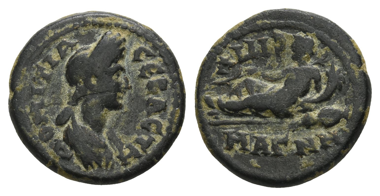 ΔOMITIA CЄBACTH, draped bust to right / MAΓΝH CIΠV, river god Sipylos reclining to left, holding reed in his right hand, cornucopia in his left and resting his left elbow upon overturned urn from which liquid flows. RPC II, 986; GRPC 122; SNG Copenhagen 259; SNG von Aulock 3003. 2.77gr, 16mm, 1h.