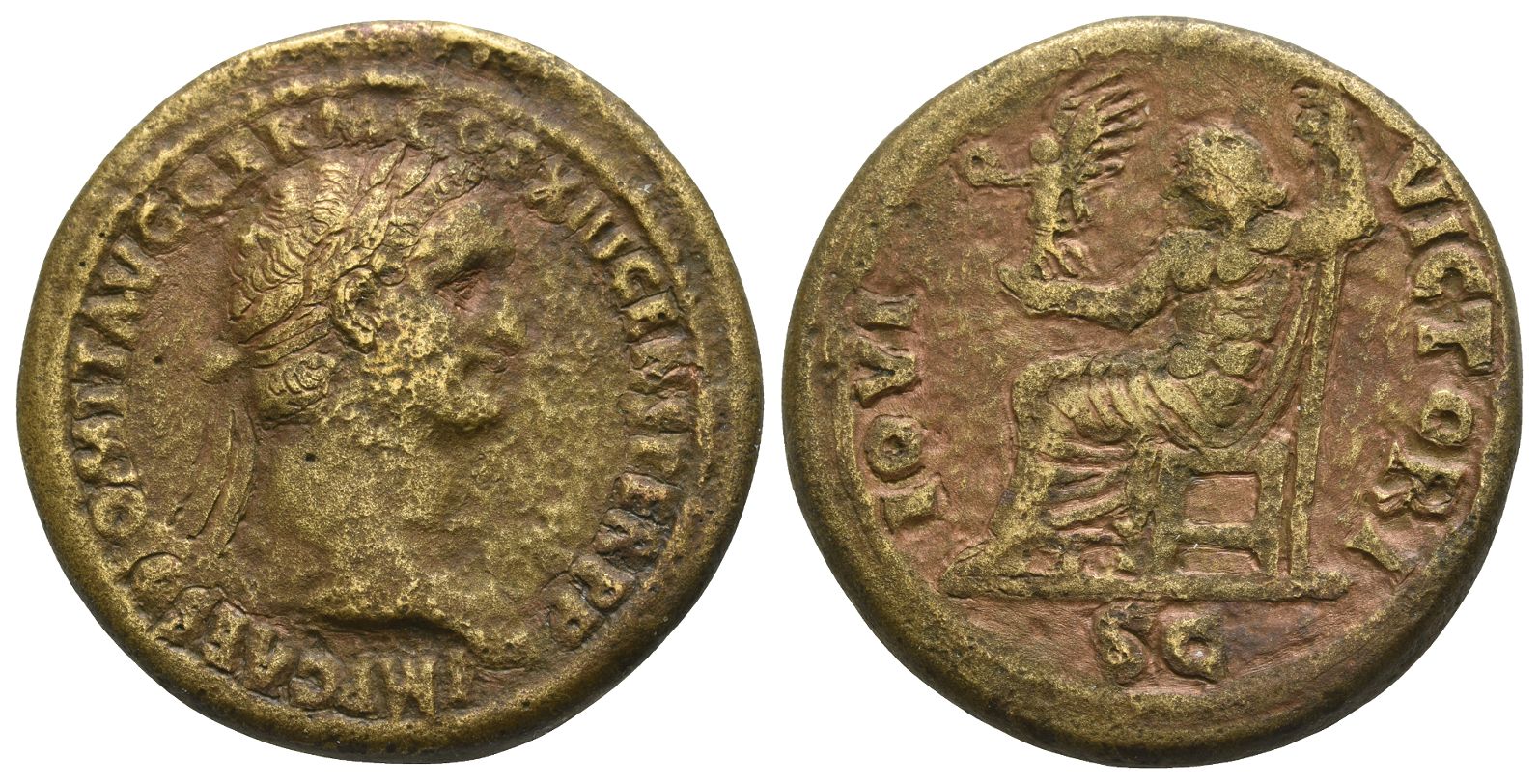 Rome. IMP CAES DOMIT AVG GERM COS XIII CENS PER P P, laureate head to right / IOVI VICTORI, Jupiter seated to left, holding Victory and sceptre; S C in exergue. RIC II.1 633; C. 313; BN 436; BMCRE 406. 28.76gr, 34mm, 7h.